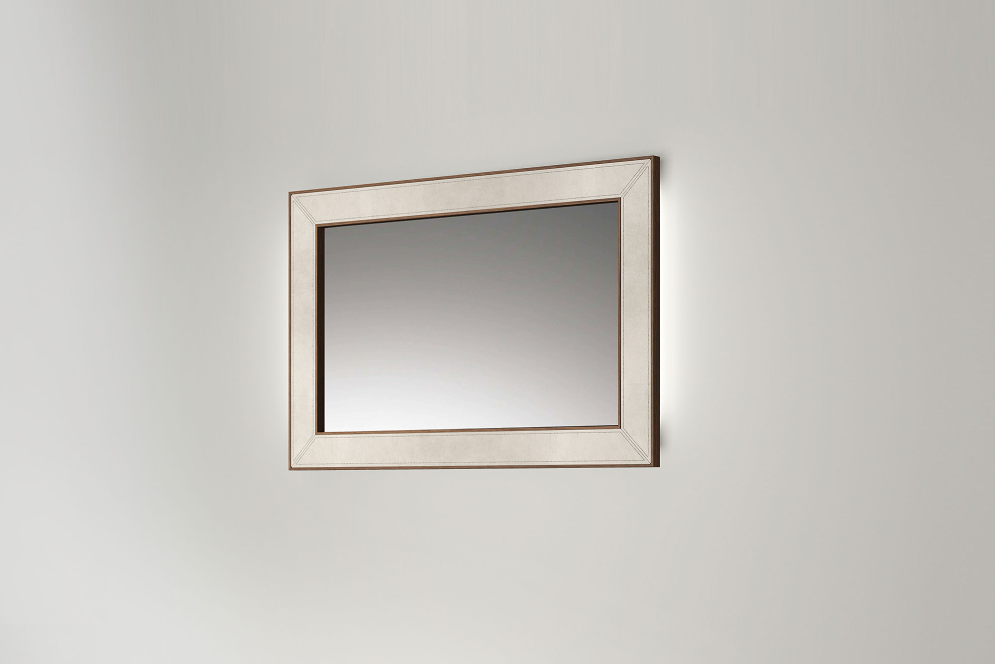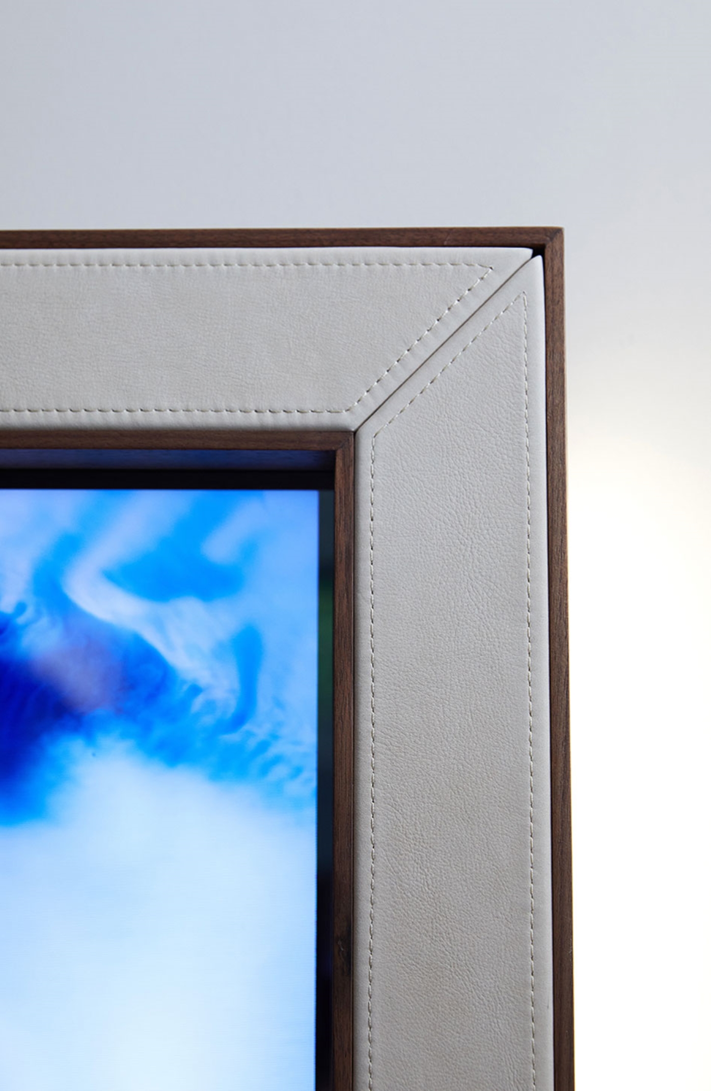 Double è una collezione che nasce da un concept basato sul desiderio di valorizzare le caratteristiche di un materiale caldo e vivo come il legno, dotato di un’espressività senza eguali. Questa cornice è caratterizzata da linee pure e finemente lavorate, che esaltano tutto il pregio del legno massello di Noce Canaletto. La parte interna è arricchita da un rivestimento in pelle Nabuk con cuciture sartoriali.