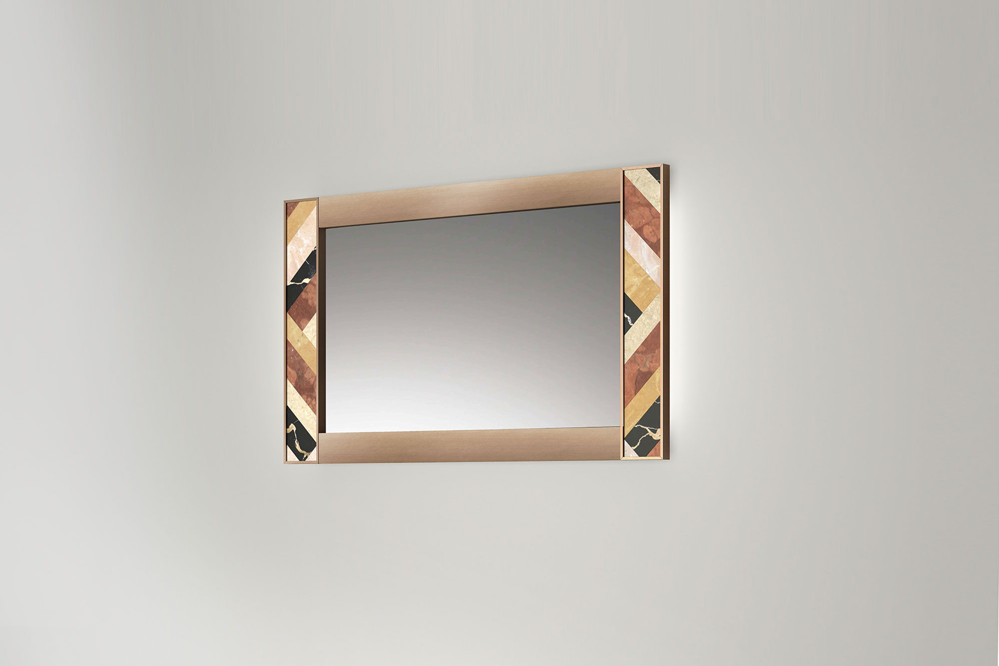 I marmi policromi intarsiati con un decoro geometrico esaltano il carattere grafico del modello Tarsia. Lo spunto nasce dai colori e dai materiali utilizzati negli ingressi dei palazzi storici milanesi: le tonalità garbate sono accostate tra loro attraverso un gioco di razionale bellezza. Il telaio in metallo con finitura bronzo, connette le due estremità laterali decorate, realizzando un’alternanza di equilibri e squilibri.