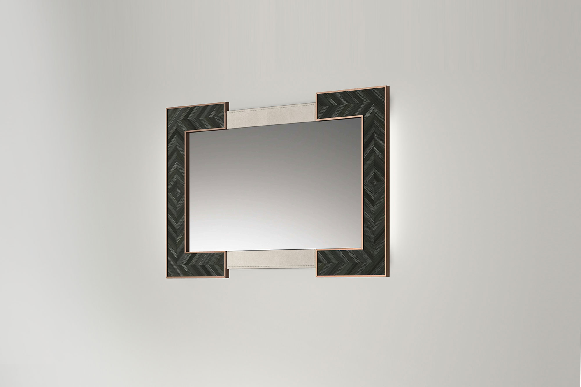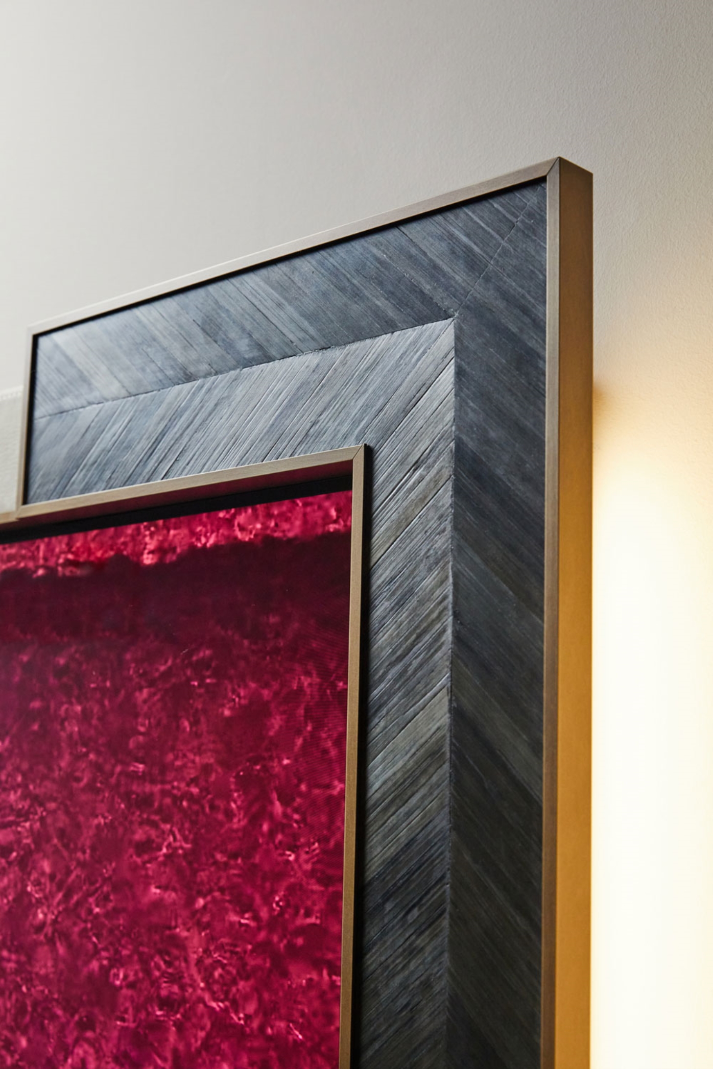 La serie Grisaglia è caratterizzata da un disegno puro ed essenziale, arricchito dall’utilizzo sapiente di materiali di sofisticata eleganza. Il profilo metallico con finitura bronzo presenta un rigoroso e raffinato motivo di montanti verticali e orizzontali. L’inserto è caratterizzato da un intarsio in paglia realizzato a mano secondo un disegno chevron. Due elementi in legno rivestiti in pelle nabuk ingentiliscono il carattere squadrato e puro di questo manufatto.